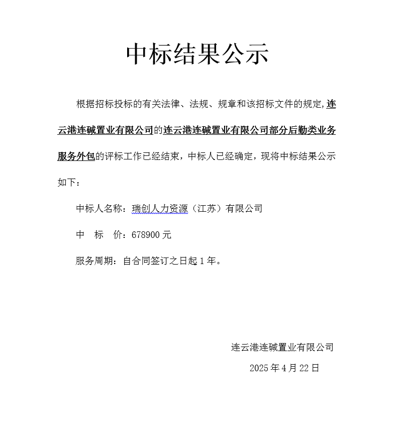 連云港連堿置業(yè)有限公司部分后勤類業(yè)務(wù)服務(wù)外包中標(biāo)結(jié)果公示